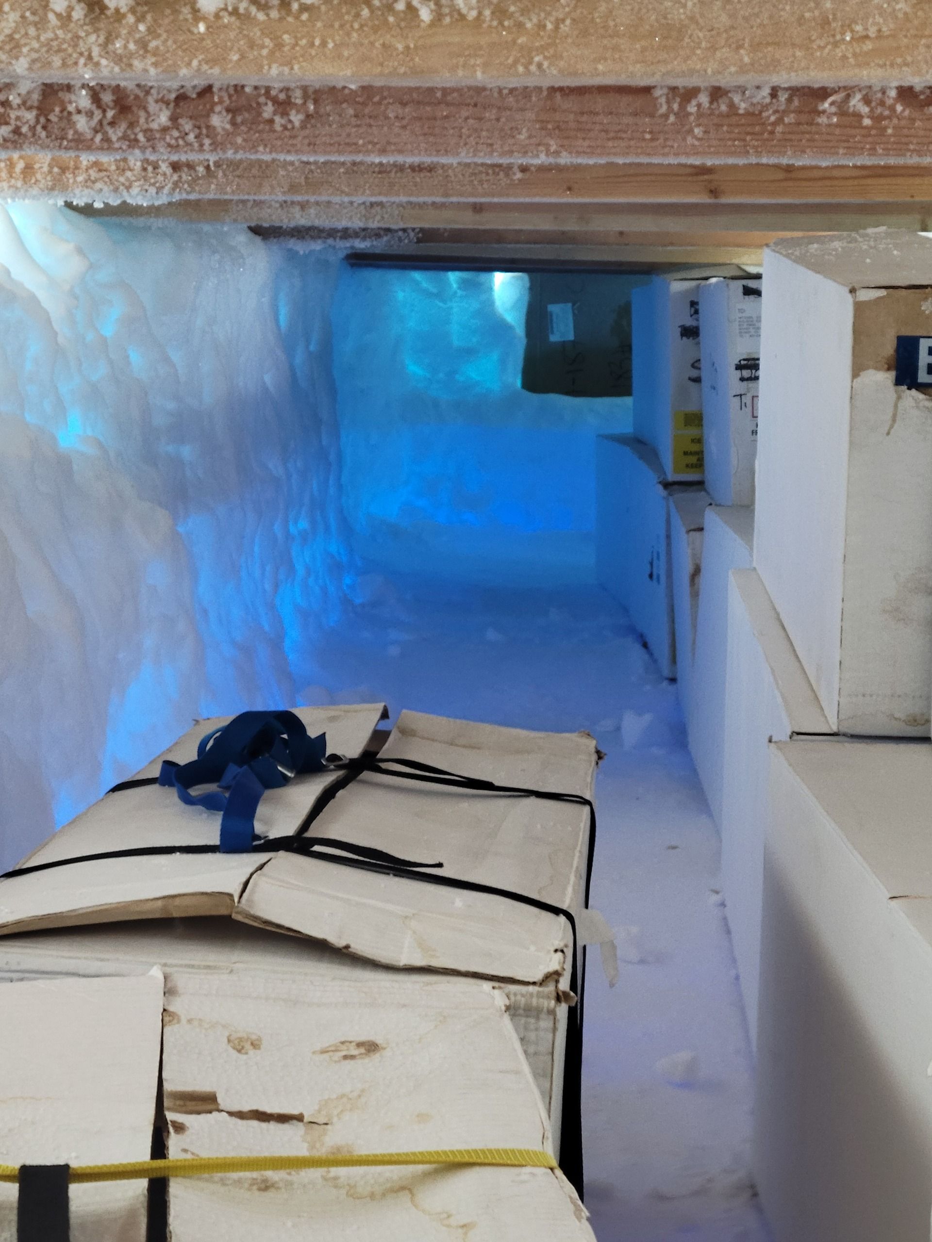 A view inside our ice storage trench. The blue color is the result of the sunlight shining through the blue ice.