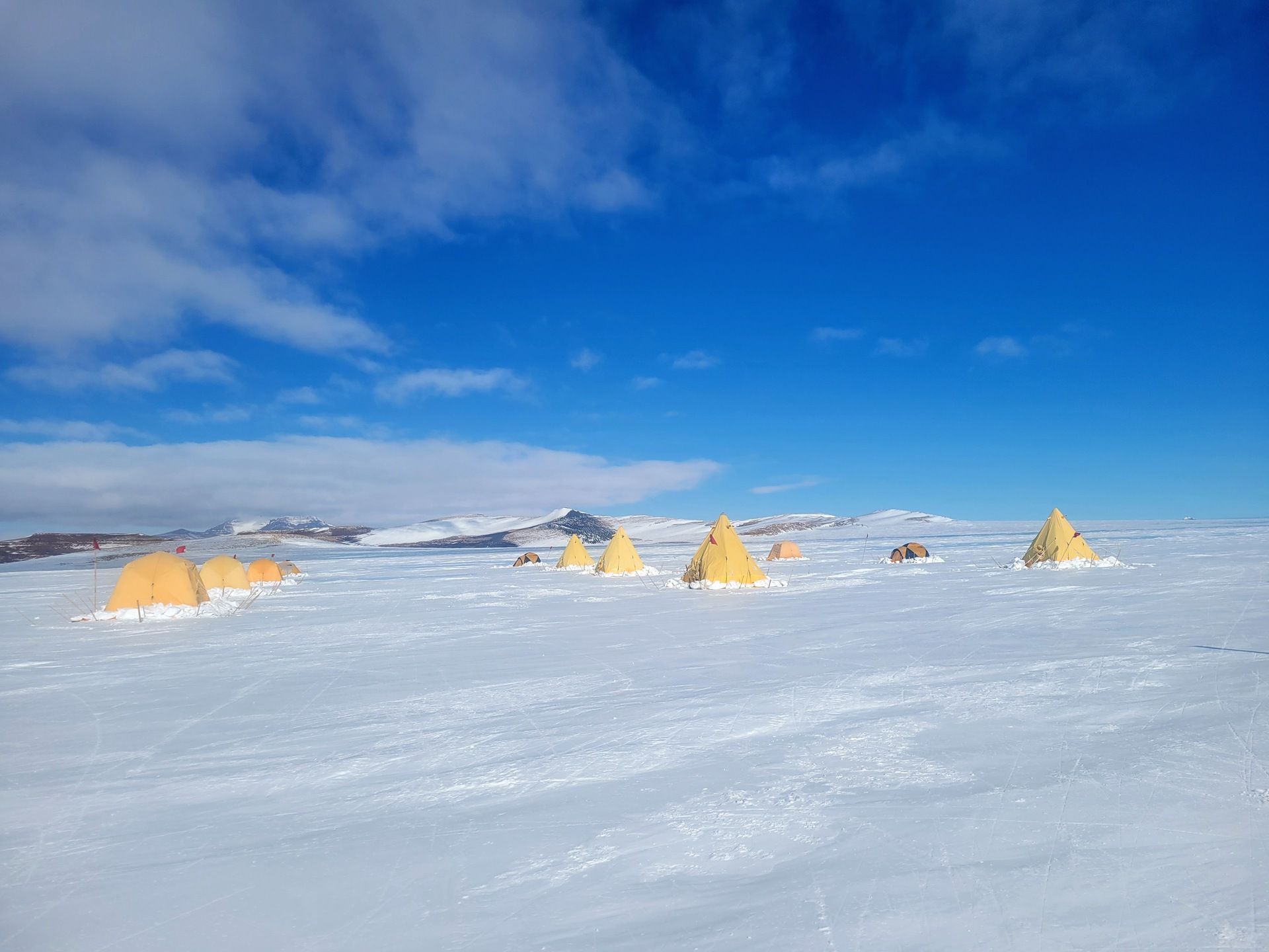 A view of our camp with the Allan Hills in the background. Much of the mass of these mountains is under the ice sheet, and they are helping to trap the blue ice here.